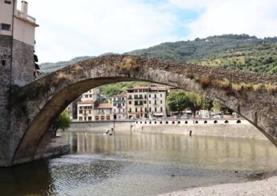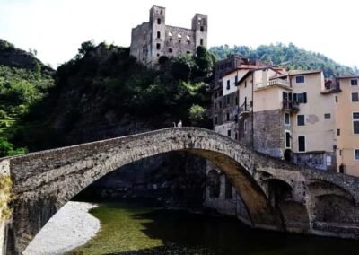 The Ponte Vecchio in Dolceacqua, an elegant medieval bridge spanning the Nervia River, is far more than a historic crossing; it’s a symbol of Ligurian beauty, artistic inspiration, and timeless connection. Built in the 15th century atop earlier foundations, the Ponte Vecchio links the village’s two distinct quarters: Terra, the original medieval settlement, and Borgo, the newer district that expanded beyond the river in later centuries. Its single arch, gracefully spanning approximately 33 meters, balances visual harmony with structural strength, embodying both functional necessity and architectural poetry. What gives the bridge its enduring fame is its magical blend of craftsmanship, setting, and cultural resonance. In 1884, the legendary Impressionist painter Claude Monet visited Dolceacqua and declared the bridge “a jewel of lightness.” He immortalized it in several paintings, most notably Bridge at Dolceacqua, capturing its luminous elegance alongside the silhouetted ruins of the Castle of the Doria in the background.