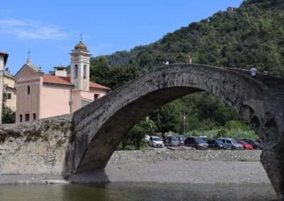 Below the castle, the graceful arched bridge that spans the Nervia River is perhaps the most iconic image of Dolceacqua. It was immortalized by the French impressionist Claude Monet during his visit in 1884, who described it as “a jewel of lightness.” Today, the bridge continues to unite the old town with the newer Borgo district, much as it unites history and modern life. Visitors crossing it are immediately captivated by the harmony between architecture and nature that defines this small yet extraordinary place.
