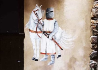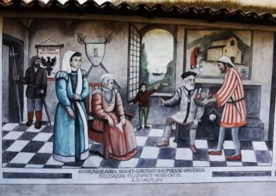 Situated just behind Dolceacqua’s medieval center, Via Monsignor Giuseppe Laura traces a discreet yet meaningful path parallel to the Nervia River, combining everyday life with subtle charm. This street is a local microcosm, hosting familiar neighbourhood touches, from a cosy Crep’Monet cafe-bar offering crepes and spritz with views overlooking the village, to small shops and airy walkways that echo Dolceacqua’s relaxed pace. A particularly distinctive feature along the street is the Fontana del Rossese. Though it doesn’t dispense wine, this imaginative fountain presents water with a reddish hue, a playful nod to Dolceacqua’s celebrated Rossese wine. It stands near the symbolic Gombo monument, together representing the area’s agricultural heritage, especially its wine and olive oil traditions.