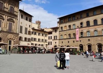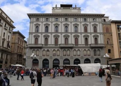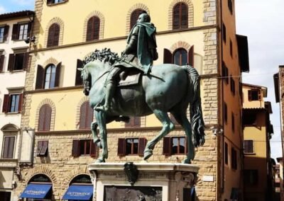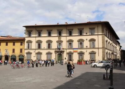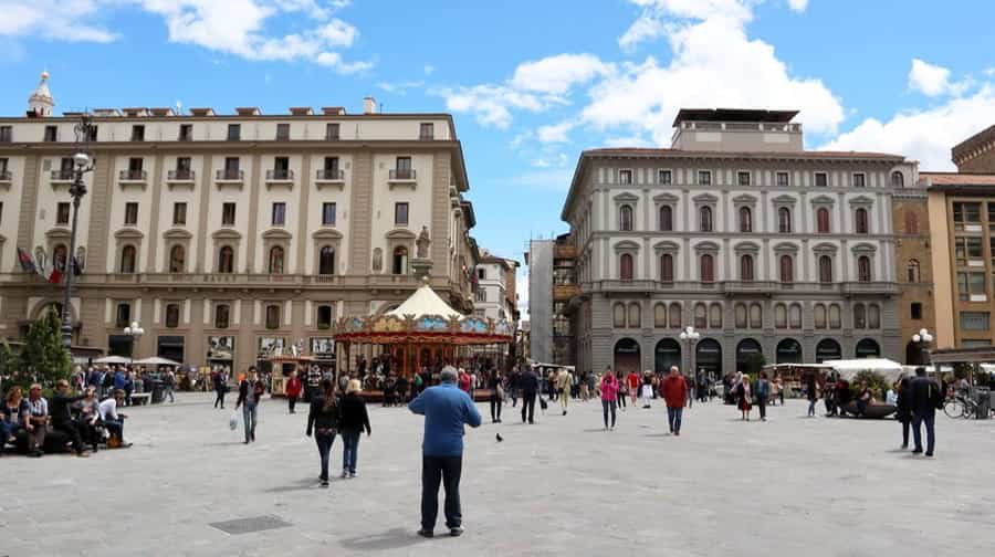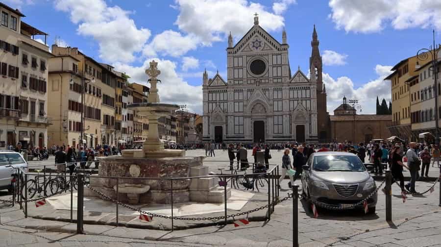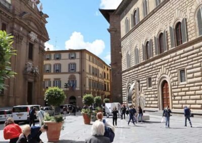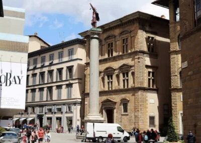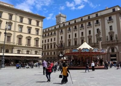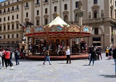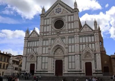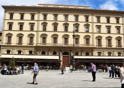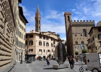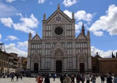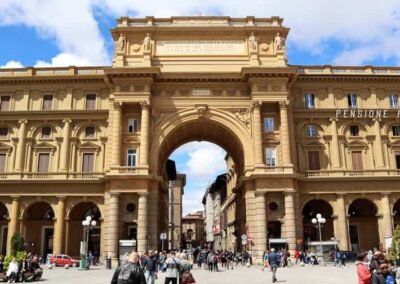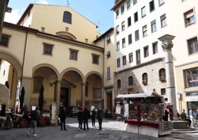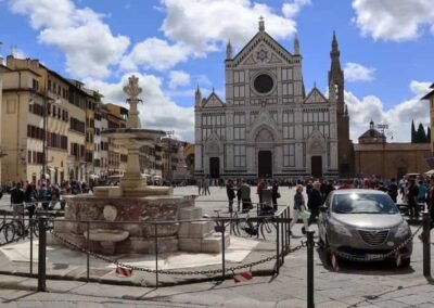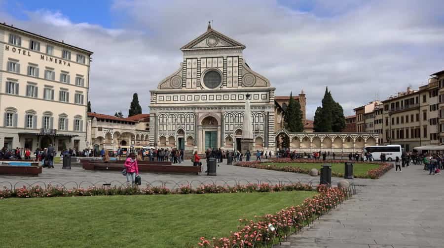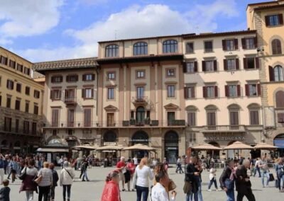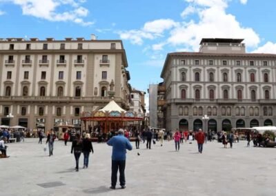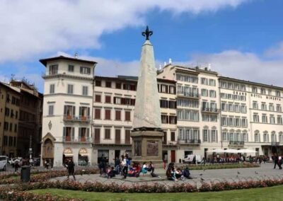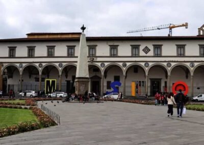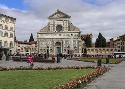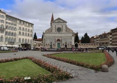 The Piazza di Santa Maria Novella, situated just a short walk from Florence’s main railway station, is one of the city’s most elegant and historically significant squares. Dominated by the magnificent façade of the Basilica of Santa Maria Novella, the piazza offers an exquisite blend of medieval charm, Renaissance artistry, and vibrant urban life. The origins of the square date back to the Middle Ages, when it served as an open space in front of the Dominican church and convent of Santa Maria Novella, begun in the 13th century. Over time, it was enlarged and paved to accommodate religious gatherings, public events, and even sporting competitions. In the late 16th century, under the patronage of Grand Duke Cosimo I de’ Medici, the piazza underwent significant transformation.