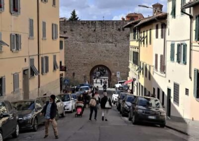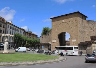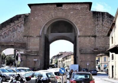 Porta Romana is a historic gateway located in Piazzale di Porta Romana, Florence. Built in the late 13th century, this imposing structure was one of the key entrances to the city, originally part of Florence’s defensive walls. The gate’s strategic location on the southern side of Florence controlled access from the Roman road that led to Rome, marking its significance in medieval times. The architecture of Porta Romana combines both medieval and Renaissance elements. The gate features a robust, arched design typical of medieval fortifications, with a large central archway that allowed passage for both people and goods. The tower above the arch provided a vantage point for guards to oversee and manage the flow of traffic into the city.