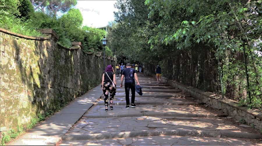 The walk starts at Via delle Porte SanteAbbazia di San Miniato al Monte – Via di S. Salvatore Al Monte – Chiesa di San Salvatore al Monte – Piazzale Michelangelo – Passaggio Via del Monte alle CrociGiardino delle rose, Viale Giuseppe Poggi – Via del Monte alle Croci – Porta San Miniato – Via S. Miniato – Via di S. Niccolò – Via dei Rena – Piazza Nicola DemidoffLungarno SerristoriLungarno Torrigiani