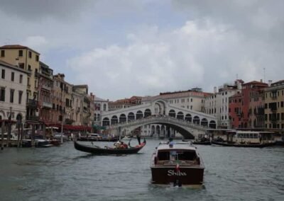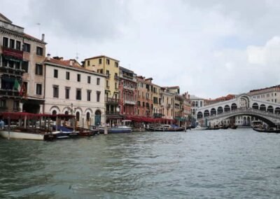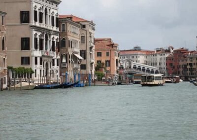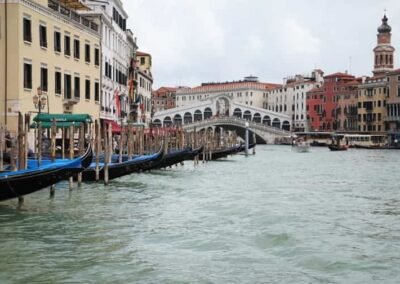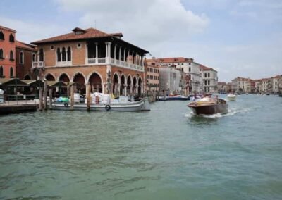 The Grand Canal is famously lined with more than 170 historic buildings, many of which date back to the 13th and 18th centuries. These structures showcase a remarkable range of architectural styles, including Byzantine, Gothic, Renaissance, and Baroque. Some of the most iconic palaces and landmarks include the Ca’ d’Oro, a stunning Gothic palace with a façade that once gleamed with gold, and the Palazzo Barbarigo, adorned with mosaics that make it stand out among the more traditional Venetian designs. One of the most famous crossings of the Grand Canal is the Rialto Bridge, the oldest of the four bridges that span the canal. Built in the late 16th century, this stone arch bridge has become one of Venice’s most recognized symbols, attracting thousands of visitors each year. Lined with shops and offering panoramic views of the canal, the Rialto Bridge is a must-see for anyone exploring Venice.