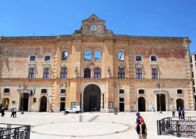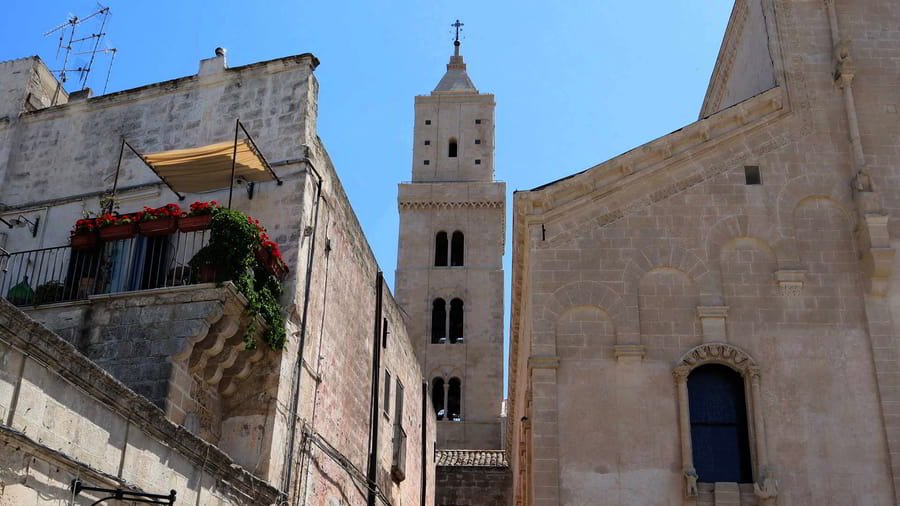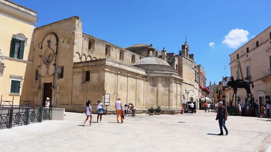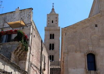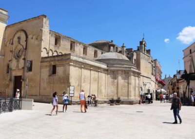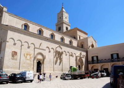 Piazza Duomo is one of the most prominent and picturesque squares in Matera, Italy, offering a captivating glimpse into the city’s rich architectural and cultural heritage. The square is centrally located and serves as a focal point of Matera’s historic centre, surrounded by stunning examples of medieval and Renaissance architecture. Dominating the piazza is the impressive Cathedral of Matera (Duomo di Matera), a majestic Romanesque church dedicated to the Madonna della Bruna and St. Eustace. The cathedral, built in the 13th century, features a striking façade with intricate carvings and a grand portal. Its bell tower, visible from various parts of the city, adds to the square’s grandeur and serves as a landmark for visitors.