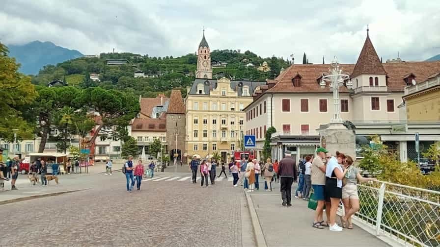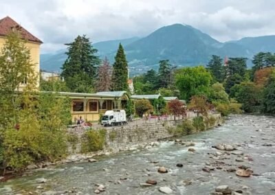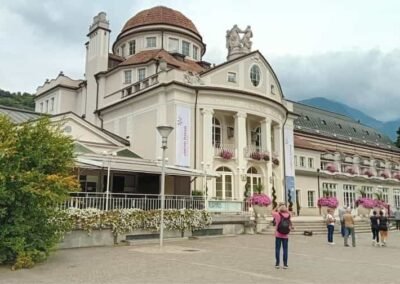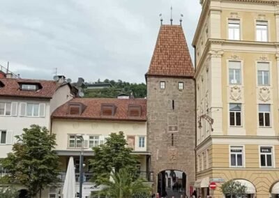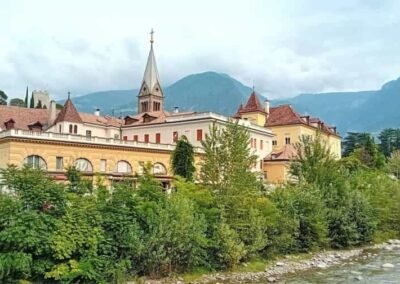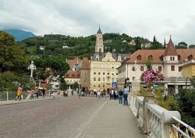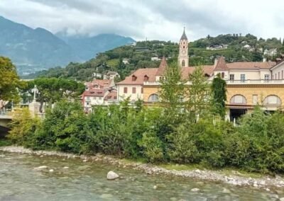 Merano, a picturesque town in South Tyrol (or Alto Adige), Italy, is a gem nestled between alpine peaks and Mediterranean landscapes. Known for its unique blend of Italian and Austrian influences, Merano (or Meran in German) is celebrated for its natural beauty, historic architecture, and wellness culture, making it a popular destination year-round. The town sits in the verdant Adige Valley, with the Ötztal Alps rising majestically to the north and the Dolomites shaping the landscape to the south. This geography gives Merano a stunning scenic backdrop, as well as a mild, almost Mediterranean climate unusual for such a mountainous region. The climate has long attracted visitors seeking a reprieve, which is why Merano is renowned as a spa town, with therapeutic traditions dating back to the 19th century when European nobility flocked to its healing waters. Today, the Merano Thermal Baths are a contemporary version of this legacy, drawing visitors to relax in mineral-rich waters while enjoying sweeping mountain views. Merano’s rich history dates to the early Middle Ages, and its heritage reflects a dynamic mix of Italian and Austrian influences. It was part of the Habsburg Empire until after World War I, and this cultural blend remains visible in Merano’s dual-language culture, where both Italian and German are spoken, and the architecture, a combination of elegant Austrian-style villas and Mediterranean-style buildings. Walking through Merano’s historic centre, visitors encounter narrow cobbled streets, pastel-coloured houses, and medieval arcades filled with artisan shops, cafés, and galleries. Landmarks like the Kurhaus, a grand Art Nouveau building by the river, and the Merano Theatre showcase the town’s artistic side and are popular stops for architecture lovers.