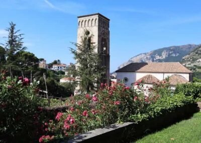 One of the villa’s most remarkable features is its architecture, which blends Arab, Norman, and medieval influences. Visitors can explore its ancient towers, stone courtyards, and arcades, all of which reflect Ravello’s role as a crossroads of cultures. The Torre Maggiore, a striking medieval tower, stands as a symbol of the villa’s past grandeur, while the chapel, adorned with delicate frescoes, reveals its spiritual side. Yet it is the villa’s gardens that most captivate visitors. Designed on terraces that cascade down the cliffside, the gardens are filled with vibrant flowers, cypress trees, and exotic plants, offering panoramic views of the sea and coastline below.