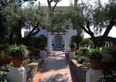 Villa Cimbrone, located on Via Santa Chiara in the enchanting town of Ravello on Italy’s Amalfi Coast, is a remarkable villa celebrated for its breath-taking views, lush gardens, and historical significance. Perched on a cliff overlooking the Tyrrhenian Sea, Villa Cimbrone dates to at least the 11th century, though it took on its current form in the early 20th century under the direction of English nobleman and historian Lord Ernest William Beckett. With its blend of medieval, Moorish, and classical architectural influences, the villa offers a unique synthesis of styles that reflect the tastes of the many artists, writers, and thinkers who found inspiration here. One of Villa Cimbrone’s most famous features is its extensive terraced gardens, often considered among the most beautiful in Italy. Designed in the romantic English garden style, the gardens are filled with Mediterranean and exotic plants, along with statues, fountains, and sculptures strategically placed to create an enchanting, almost otherworldly atmosphere. Winding paths lead visitors through cypress-lined avenues, past hidden groves, and to quiet alcoves where visitors can sit and absorb the peaceful surroundings. The gardens reflect a carefully curated blend of nature and art, offering both lush vegetation and elegant structures, including a tea pavilion and a rose garden, which add to the villa’s ethereal charm. The gardens culminate in The Terrace of Infinity, one of Villa Cimbrone’s most famous attractions and one of the most breathtaking viewpoints on the Amalfi Coast. The terrace, bordered by a series of classical marble busts, offers panoramic views of the coastline that seem to stretch endlessly into the sea and sky, giving the feeling of floating above the world. On clear days, one can see the azure waters of the Tyrrhenian Sea, along with nearby coastal towns dotting the landscape below. This iconic terrace has captivated countless visitors, from artists and writers seeking inspiration to tourists eager to capture the beauty of the Italian coast. It is not surprising that Gore Vidal, the famous American writer, once declared that the view from the Terrace of Infinity was the finest in the world.