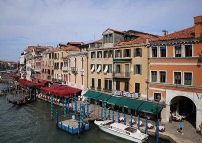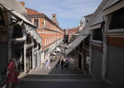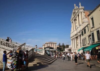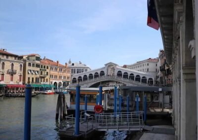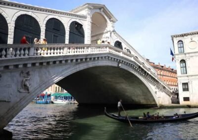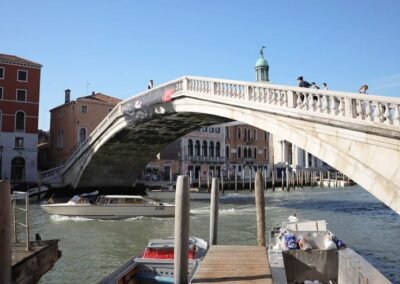 The Ponte di Rialto is one of Venice’s most iconic landmarks and the oldest of the four bridges spanning the Grand Canal. Completed in 1591 to replace a series of earlier wooden bridges, it was designed by Antonio da Ponte, whose daring single-span stone arch became a masterpiece of Renaissance engineering. The bridge connects the San Marco and San Polo districts, standing at the heart of Venice’s historic commercial area. Lined with elegant arcades that house small shops selling jewellery, souvenirs, and Venetian crafts, the Rialto Bridge remains a vibrant hub of city life. From its broad central archway, visitors enjoy one of the most famous views in Venice—the Grand Canal framed by palaces and gondolas gliding below. Both a practical crossing and a symbol of Venetian pride, the Ponte di Rialto beautifully embodies the city’s blend of art, commerce, and timeless architectural grandeur.