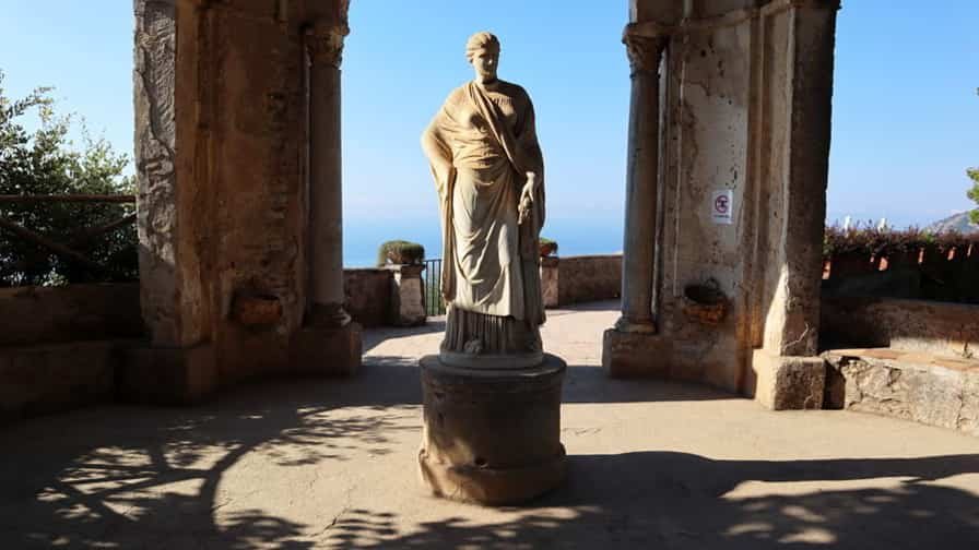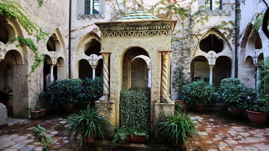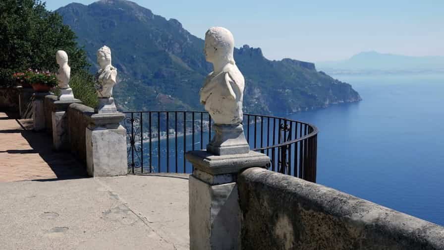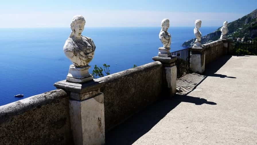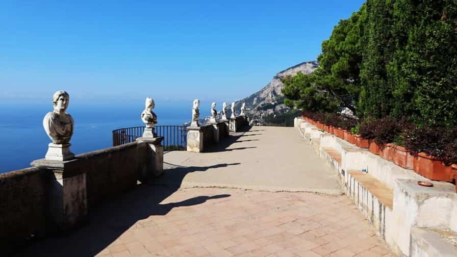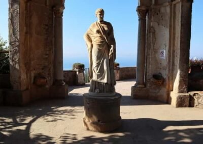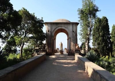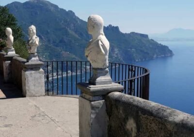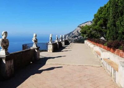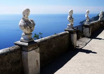 The heart of Villa Cimbrone is its renowned “Terrace of Infinity,” a spectacular panoramic viewpoint that seems to float above the sea. Lined with marble busts, the terrace offers one of the most extraordinary vistas in all of Italy, where the blue of the sky and the sea merge into a single, endless horizon. This terrace has been described as one of the most beautiful in the world, attracting visitors seeking both serenity and inspiration. The villa’s gardens are equally remarkable, filled with roses, hydrangeas, ancient trees, and sculptures hidden among winding paths and shaded groves.